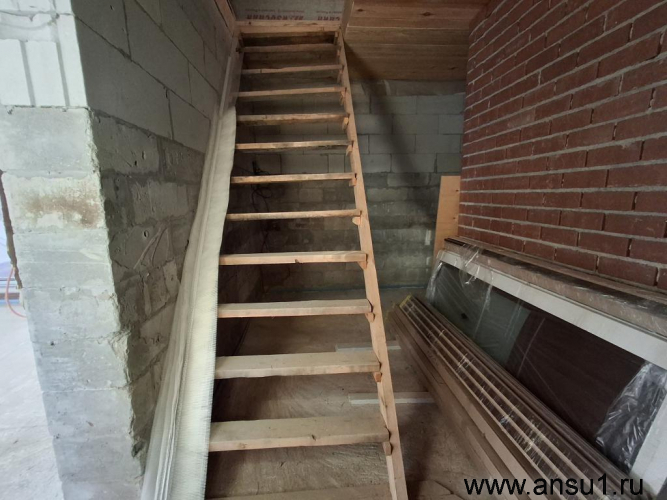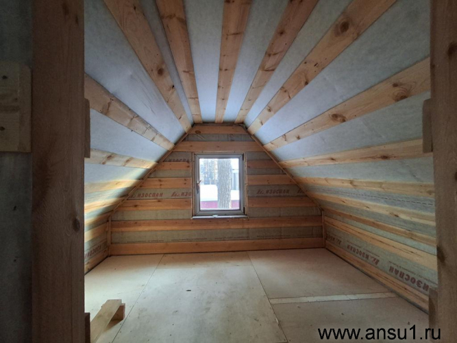 1 этаж – комната с панорамными окнами, настоящая русская баня, санузел и деревянная лестница на второй этаж.