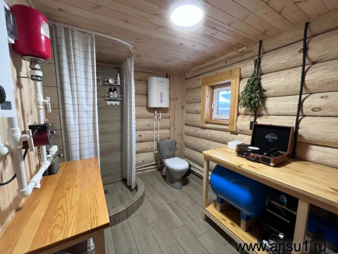 Продуманная до мелочей, баня готова для использования круглогодично: теплые полы, эл-во 380 15 кВт, скважина 42 м и компактная выгребная яма. Газ проходит по фасаду участка.