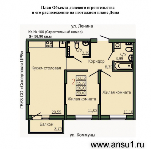 2-х к.кв. 56,1 кв.м, 5/5 этаж в г.Сысерть мкр.Новый, ЖК Сказы.