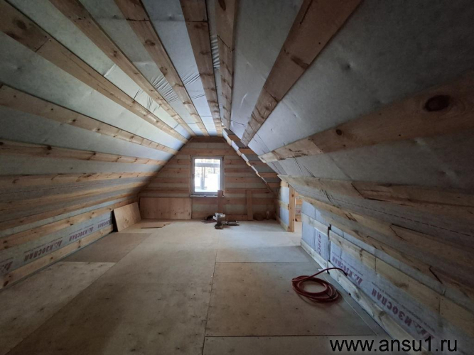 1 этаж – комната с панорамными окнами, настоящая русская баня, санузел и деревянная лестница на второй этаж.