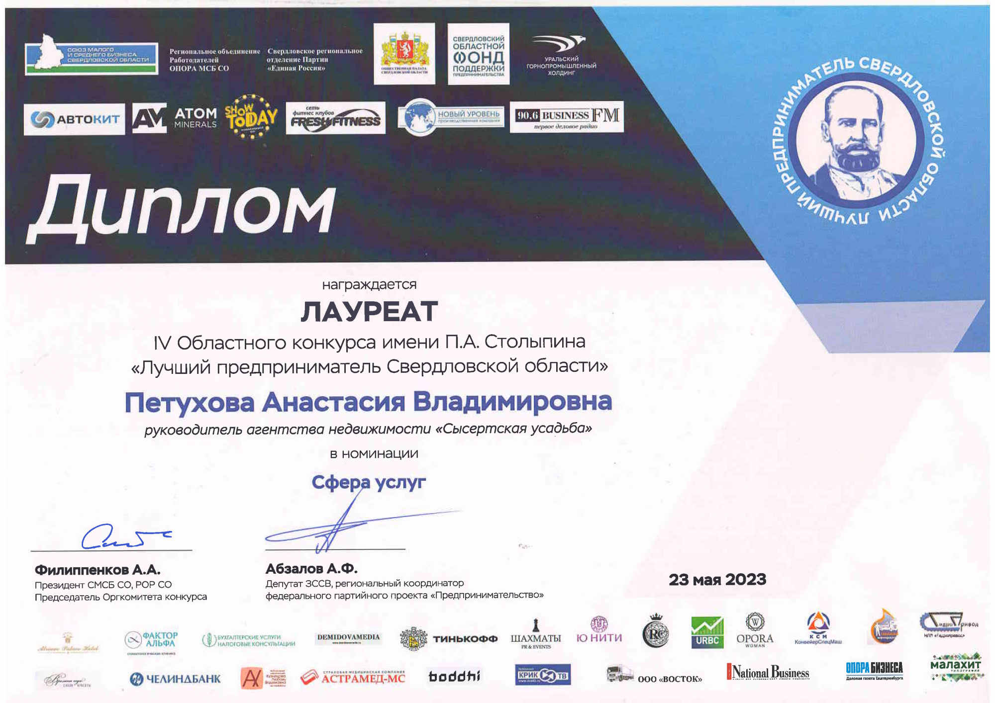 Агентство недвижимости Сысертская усадьба стало лауреатом четвертого областного конкурса имени П.А.Столыпина "Лучший предприниматель Свердловской области" в номинации "Сфера услуг".